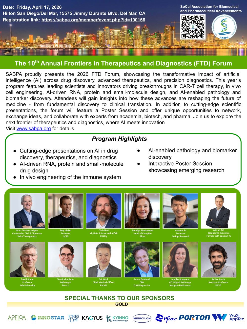 SABPA proudly presents the 2026 FTD Forum, showcasing the transformative impact of artificial intelligence (AI) across drug discovery, advanced therapeutics, and precision diagnostics.