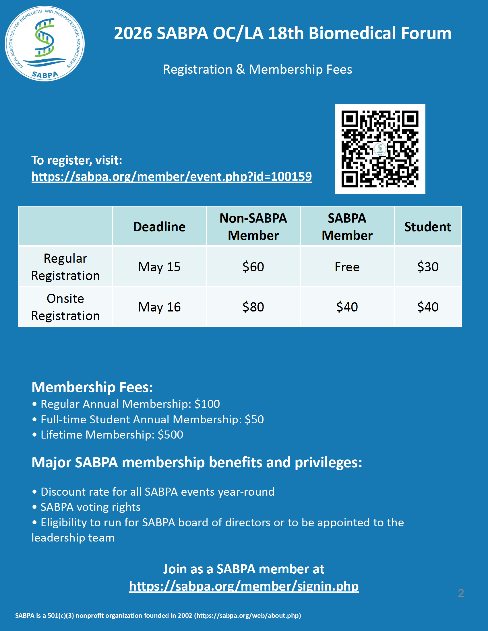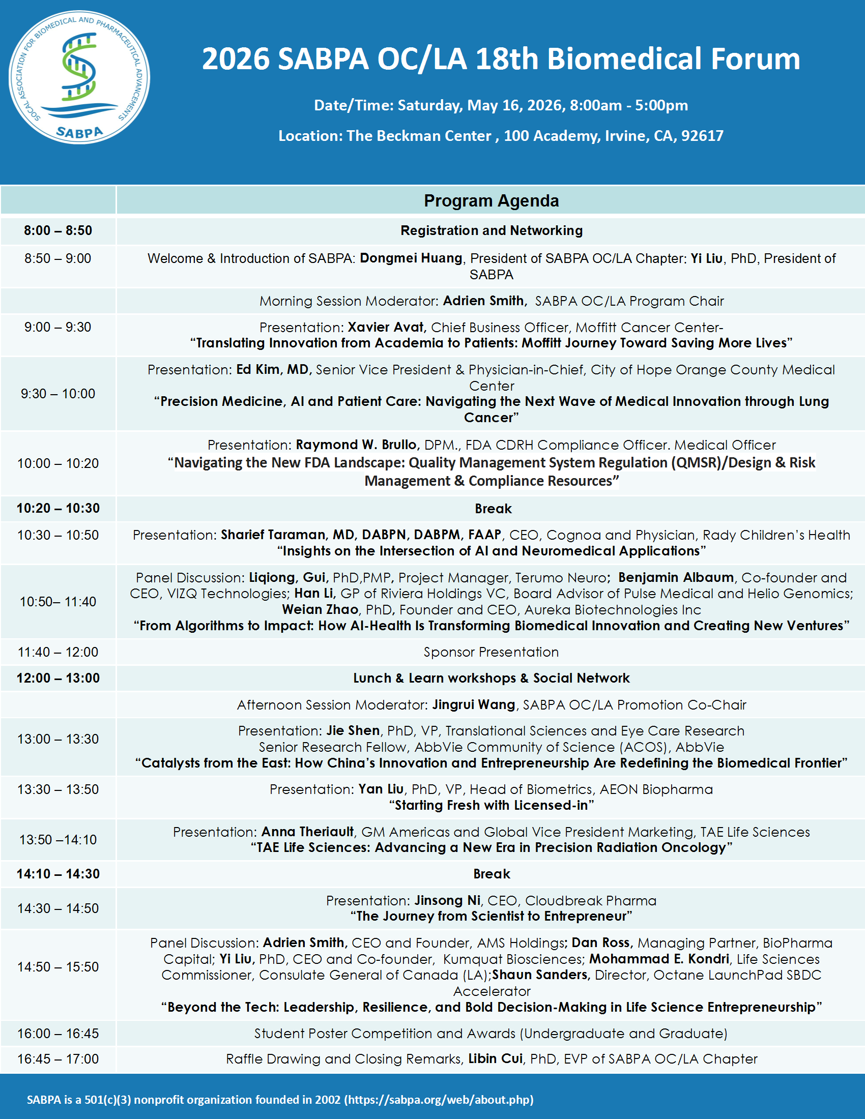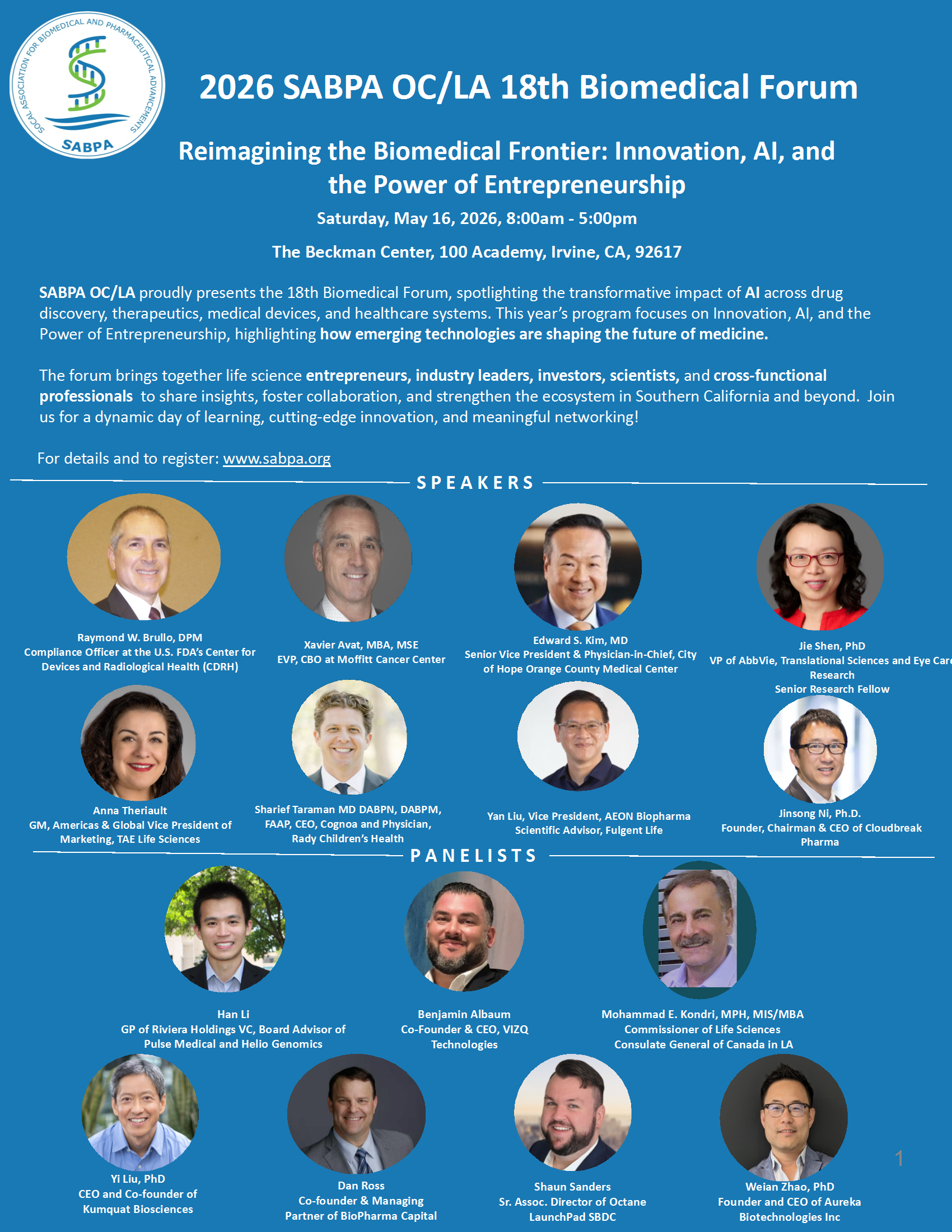 SABPA OC/LA proudly presents the 18th Biomedical Forum, spotlighting the transformative impact of artificial intelligence (AI) across drug discovery, advanced therapeutics, medical devices, and healthcare systems. This year’s program focuses on Innovation, AI, and the Power of Entrepreneurship, highlighting how emerging technologies are shaping the future of medicine and life sciences. The forum brings together life science entrepreneurs, industry leaders, investors, scientists, and cross-functional professionals to share insights, foster collaboration, and strengthen the biotechnology and life sciences ecosystem in Southern California and beyond. Join us for a dynamic day of learning, cutting-edge innovation, and meaningful networking!